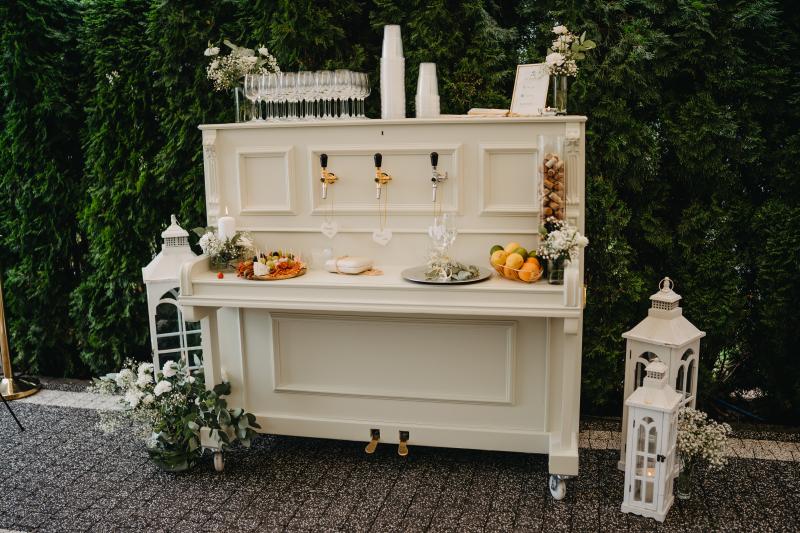 Nasz Mobilny Pianino Bar to wyjątkowe połączenie stylu i funkcjonalności. Umożliwia serwowanie piwa, wina (białego i czerwonego), prosecco oraz gotowych drinków, takich jak Hugo czy Aperol Spritz. Oprócz praktycznego zastosowania pełni także rolę niezwykłej dekoracji — zarówno na sali, jak i w plenerze — tworząc idealne tło do zdjęć i nadając wydarzeniu niepowtarzalnego klimatu.